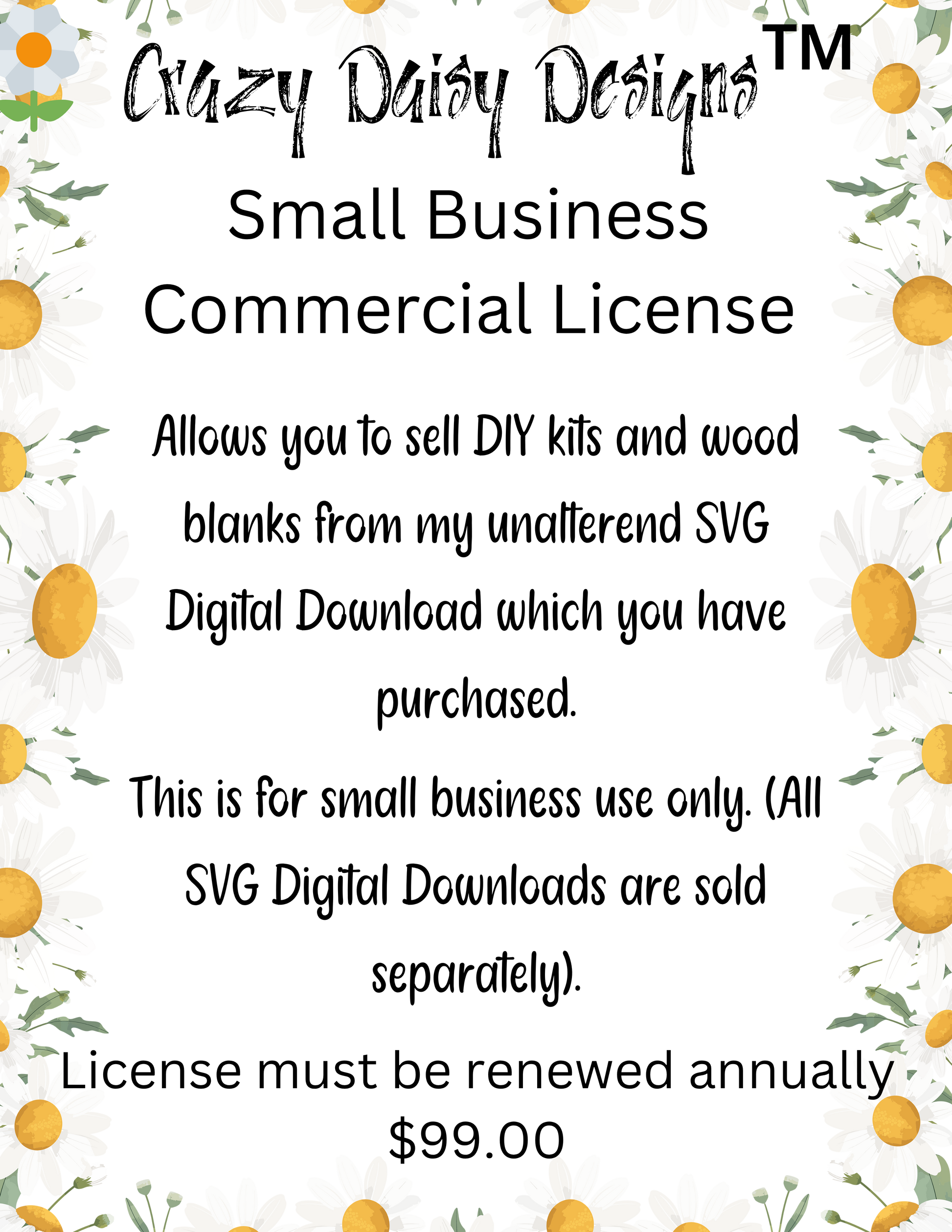 • This license is required for small businesses and makers who intend to sell unfinished wood blank kits or stencil blanks created using SVG designs from Crazy Daisy Designs™.